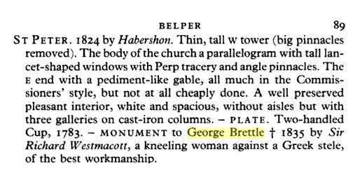Lodge, Brixton-hill (born 1st Jan. 1778, died 18th Oct. 1835)… Source: Textile history Volumes 7-8, Page 31 IGI: George was buried 28/10/1835 St Matthew, Brixton, Surrey – gives birth year as 1777 Gentleman’s Magazine Volume 159 – Marriages (Oct 1835): At Brixton, The Rev. C. Jollands Rector iof Little Munden, Herts to Mary, eldest dau of G Brettle esq of Raleigh Lodge. The Leeds Mercury, Sat 12 Sept 1835; Issue 3507 [Thursday] at St Matthew's, Brixton, by the Rev Edwin Rodgers, A.M., the Rev CHARLES JOLLANDS, rector of Little Mundon[?], Herts, to MARY, eldest dau of GEORGE BRETTLE, esq, of Raleigh Lodge, Brixton." The Derby Mercury, Wed 11 Sept(?) 1835; Issue 5278 Deaths "On 29th ult, after a few hours illness, at his residence Cornwall terrace, Regent's Park London, WILLIAM WARD, esq, of the extensive firm of Ward, Brettle & Ward, whose manufacturing establishment is at Belper, in this county." … ie. DERBYSHIRE The Derby Mercury, Wed 21 Oct 1835; Issue 5388. "On the 18th inst, at Belper, in this county, in his 58th year, much lamented & deservedly respected, GEORGE BRETTLE, esq., of Wood St, Cheapside, London and of Raleigh lodge, Brixton, SRY." The Belfast News-Letter (Belfast, Ireland), Tue 10 Nov, 1835; Issue 10266 "GEORGE BRETTLE, esq, who died at Belpher [sic] last week was the most extensive owner of stocking frames in the kingdom. In and about Belpher he employed 1,600 frames, chiefly for the making of cotton stockings. Mr Brettle is said to have died worth several hundred thousand pounds."