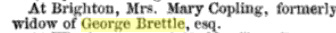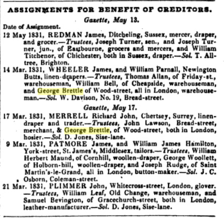 Did Geroge marry Mary HORTON or Mary ELLIS? The Derby Mercury (Derby, England), Thursday, May 21, 1812reports on the "The Framework Knitter's Bill. The United Committees of the Framework Knitters of Derby & Nottingham … thanking for subscriptions towards expenses in the Application to Parliament for a Bill to 'Regulate their Trade'." Messrs Ward, Brettle & Ward, hosiers, were amongst their Derby subscribers 1819 an advert gives his Wood street address as no. 119 Wood-street, Cheapside, and specifies the "disposal of his hosiery shop on Oxford-street, opposite the Pantheon" — possibly in order to move to bigger premises if he was doing that well. The Morning Chronicle (London), Mon 22 Sept 1823; Issue 16981. indicates a "dissolution of the firm J Ward, G Brettle & W Ward, of Belper, Derbyshire so far as relates to J Ward." So, J ward was parting from the other two. This suggests that the centre of business activities lay in Belper, Derbyshire - originally at least. It may suggest that they started there and that your George Brettle may in fact hail from there and moved his home to London as he climbed the social and business ladder. The Morning Chronicle (London), Tue 7 Oct 1828; Issue 18427. "Died, At Brighton, on 4th inst., Miss EMMA BRETTLE, 2nd dau of GEORGE BRETTLE, esq., of Brixton Hill, SRY and Wood St London, in the 13th year of her age. Her truly amiable qualities had justly endeared her much affected parents." Jackson's Oxford Journal (Oxford), Sat, 18 Oct 1828; Issue 3938 "Died, EMMA, 2nd dau of GEORGE BRETTLE, esq., of Brixton Hill, SRY" The Law advertiser, Volume 9