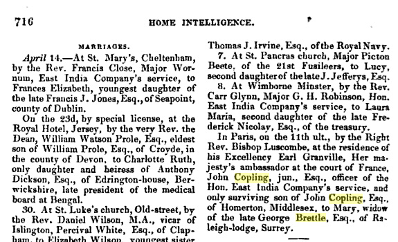 [Thursday] at St Matthew's, Brixton, by the Rev Edwin Rodgers, A.M., the Rev CHARLES JOLLANDS, rector of Little Mundon[?], Herts, to MARY, eldest dau of GEORGE BRETTLE, esq, of Raleigh Lodge, Brixton." 1839 - Parbury's oriental herald and colonial intelligencer (Vol III January to June):